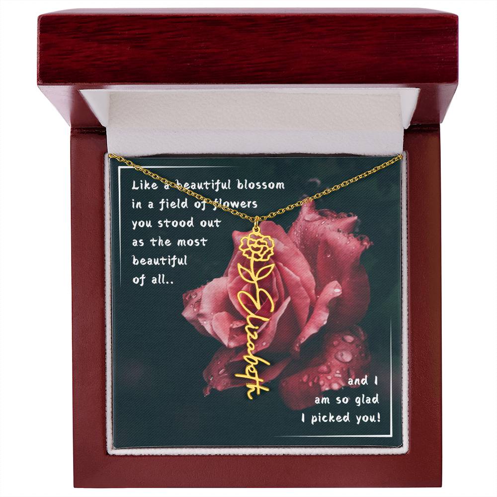 Need a gift that's as unique as she is? Then look no further than our Flower Name Necklace! This necklace is a meaningful addition to any jewelry collection. Whether you're dressing up for a special occasion or simply want to add some flair to your everyday look, this necklace is perfect for your special someone. Handcrafted from high-quality materials, it is both stylish and durable. So why wait? Personalize your own floral name necklace today!