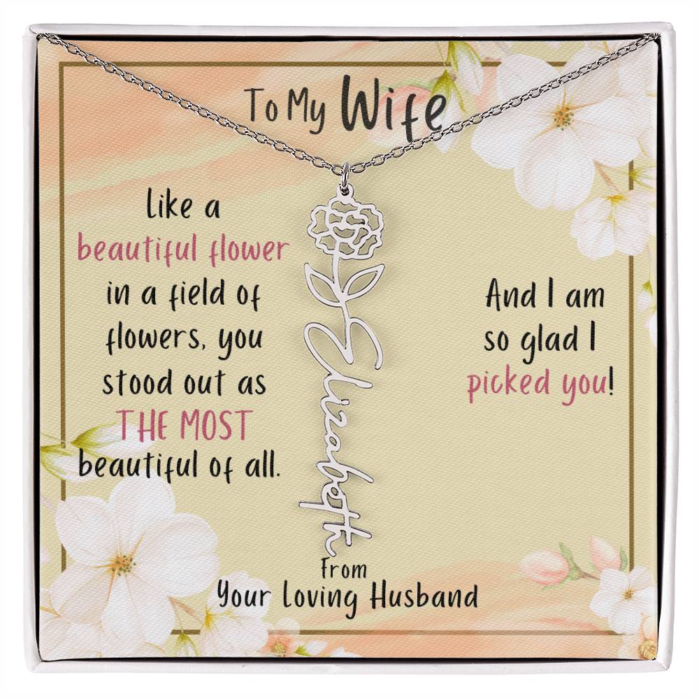 Need a gift that's as unique as she is? Then look no further than our Flower Name Necklace! This necklace is a meaningful addition to any jewelry collection. Whether you're dressing up for a special occasion or simply want to add some flair to your everyday look, this necklace is perfect for your special someone. Handcrafted from high-quality materials, it is both stylish and durable. So why wait? Personalize your own floral name necklace today!